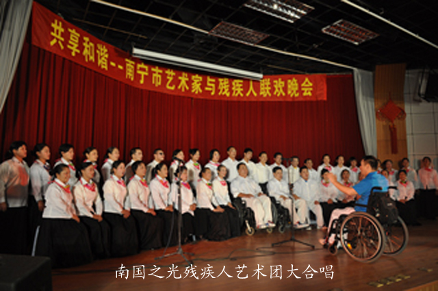南国之光残疾人艺术团在晚会中也大放异彩。该艺术团是一个公益性社会组织,曾经参加过2008、2009年南宁国际民歌艺术节绿城歌台演出,在2010年广西第七届残疾人运动会开幕式文艺表演中,他们同样受到关注。当晚,他们表演的混声小合唱《飞吧,鸽子》、童声独唱《苗家小阿妹》、闽南歌曲 《爱在一阵风》以及大合唱《歌唱祖国》等也颇具艺术水准。艺术家与残疾人同台演出,不仅让观众领略到了艺术家的风采,残疾人坚韧不拔、身残志坚的精神以及他们对艺术的热忱、追求更是深深感染了在场观众,令人们真正感受到了艺术是没有界限的。