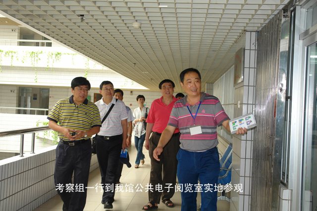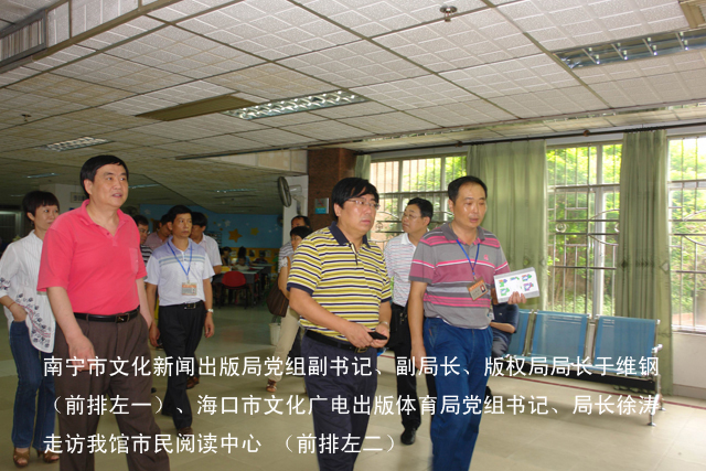 2011年6月26日上午,在南宁市文化新闻出版局党组副书记、副局长、版权局局长于维钢的带领下,海南省海口市文化广电出版体育局党组书记、局长徐涛率考察组一行六人到我馆参观考察。南宁市图书馆贺南潮馆长及覃建值副书记陪同参观,并详细介绍了我馆各项工作的开展情况。