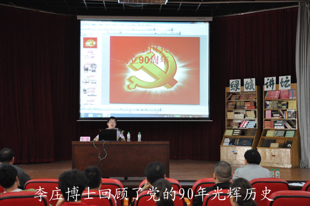 李庄博士在报告中将中国共产党90年的辉煌党史分为三个时期,以不同历史时期发生的重大党史事件为主线,着重从党领导的革命事业、社会主义建设事业和党的自身建设三个方面,回顾了中国共产党走过的90年辉煌历程;运用大量的图片和史实,深刻揭示了中国共产党在新民主主义革命时期、在社会主义革命和建设时期、在改革开放和中国特色的社会主义现代化建设新时期的探索和伟大成就。歌颂了建国以来特别是改革开放以来,在党的领导下,中国特色社会主义事业发展的丰硕成果;讴歌了中国共产党人不畏艰辛、奋力拼搏、开拓进取的优秀品质;传扬了老一辈革命家的优良传统。