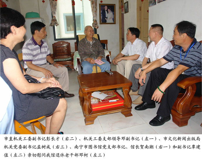 6月28日下午,在建党90周年来临之际,南宁市直机关工委副书记彭长才,机关工委支部领导邓副书记和市文化新闻出版局机关党委副书记孟树成,在南宁市图书馆党支部书记、馆长贺南潮和副书记覃建值的陪同下,对我馆困难党员、退休老干部邓柯进行入户慰问,为困难党员职工送去党组织的关心和问候。