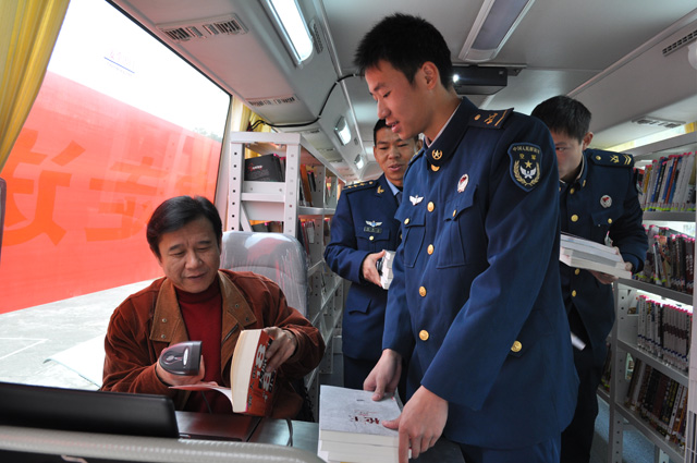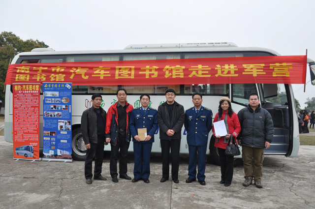 为深入贯彻落实科学发展观,构建“以人为本、普遍均等、惠及全民”的公共文化服务体系,确保2010年南宁市为民办实事项目-汽车图书馆落到实处,在南宁市委、市政府的领导下,南宁市文化新闻出版局、南宁市图书馆与驻广西空军某部共同开展 “军民共建”暨汽车图书馆走进军营双拥活动。