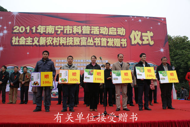 启动仪式上,与会领导向科普进广场、进社区、进学校、进农村、进企业、进机关“六大行动”单位代表授旗,并向南宁市农业推广部门、南宁市六县六城区的科技局、广西大学农学院和贺州市党员科技教育动车组学习观摩团的代表赠送了《社会主义新农村科技致富丛书》。