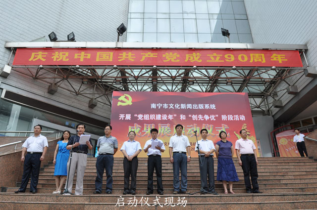 为热烈庆祝中国共产党成立90周年,市文化新闻出版局机关党委于七一前夕举办了南宁市文化新闻出版系统“党组织建设年”和“创先争优”活动阶段成果展暨表彰大会。启动仪式在南宁市图书馆门前广场举行,局机关党委书记于维钢主持了仪式,局党组书记、局长蒙文虎在仪式上致辞,市直机关工委副书记杨晓东应邀出席并宣布成果展开幕。南宁市图书馆全体党员干部参加了本次活动。