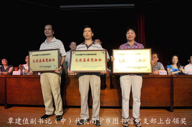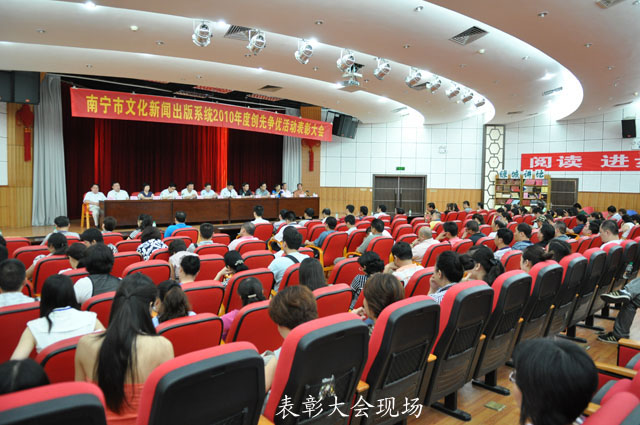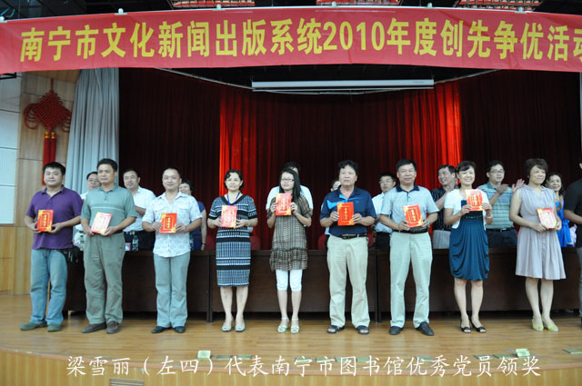 当天,文化新闻出版局机关党委还召开了表彰大会,对在“党组织建设年”和“创先争优”活动中涌现出的3个先进基层党支部、9名优秀党务工作者和33名优秀共产党员进行了表彰。南宁市图书馆党支部荣获2010年度南宁市文化新闻出版系统先进基层党组织,覃建值副书记荣获2010年度南宁市文化新闻出版系统优秀党务工作者,陈啸秋、李瑞绒、梁雪丽、蒋黎明、黄珂、蒋桂香6位同志荣获2010年度南宁市文化新闻出版系统优秀共产党员。沉甸甸的荣誉充分肯定了南宁市图书馆党支部在开展“党组织建设年”和“创先争优”阶段活动中取得的优秀成果,把开展活动作为加强党建工作、推动业务工作、提高队伍凝聚力和创造力的良好契机,不断加强基层党组织领导班子建设,按时做好基层党组织的升格换届工作,严格做好党员发展工作,扎实抓好“结对共建”活动。同时,带领支部党员干部争当带头学习提高、带头争创佳绩、带头服务群众、带头遵纪守法、带头弘扬正气的“五带头”优秀共产党员,为实现文化新闻出版事业和产业大发展大繁荣做出了积极贡献。