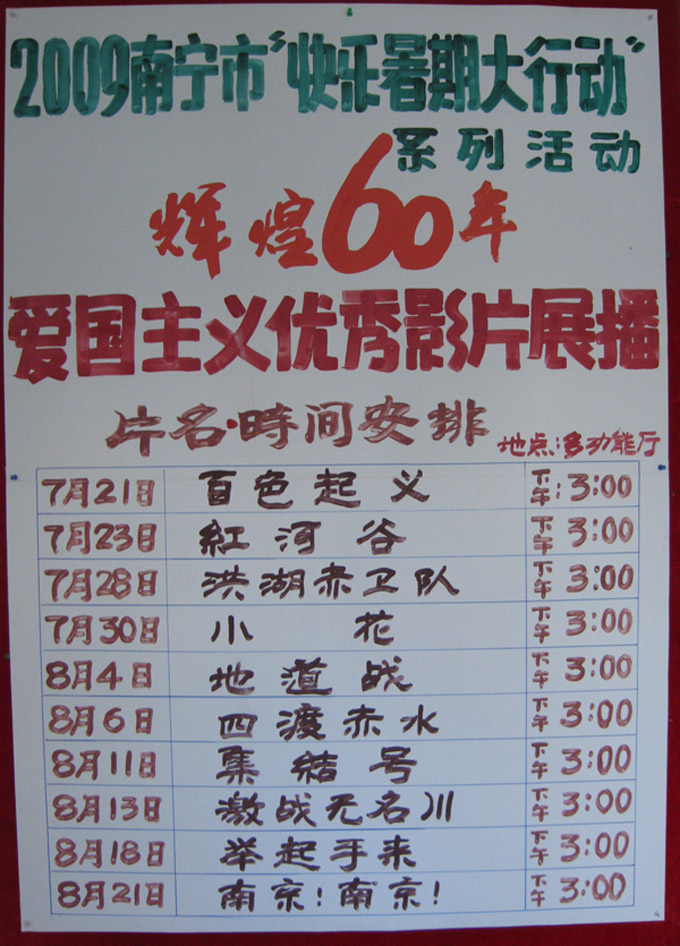 为进一步加强2009年暑期绿城未成年人思想道德社会化教育,给广大未成年人提供一个“健康、安全、快乐、有益”的暑假时段,根据2009年南宁市精神文明创建工作安排,南宁市文化局和南宁市图书馆“绿城讲坛”将推出“快乐暑期大行动”系列活动——辉煌60年暑期爱国主义优秀教育影片展播。