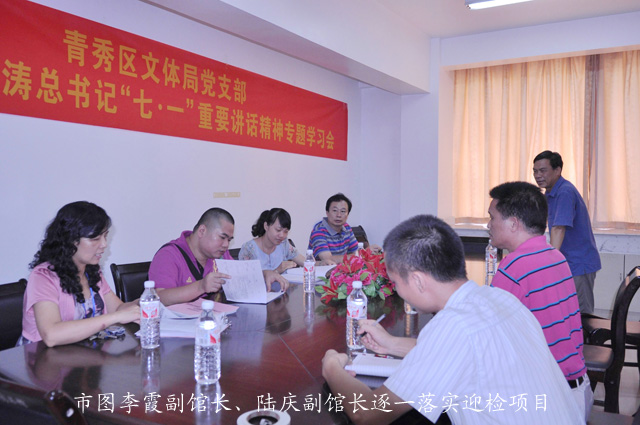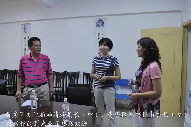 今年是南宁市创建全国文明城市复评年。为了带动全市各城区图书馆做好创城迎检工作,2011年8月16日,南宁市图书馆副馆长李霞、陆庆携技术人员来到青秀区图书馆指导工作,得到青秀区文化局赖清玲局长、青秀区图书馆韦昌本馆长的热情接待。