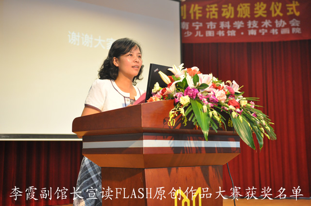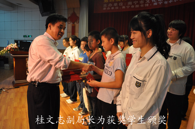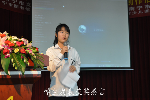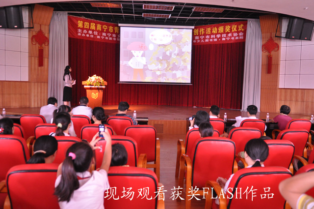 在活动中,Angle(角度)社团表演的充满张力与朝气的开场动漫秀拉开了颁奖仪式的序幕。在通过PPT回顾了南宁市第四届青少年动漫活动暨青少年书画创作活动的全程花絮之后,到场参加活动的南宁市文化新闻出版局桂文志副局长、南宁市科协潘宏球副主席和南宁市教育局何玲副调研员等领导嘉宾为获奖者颁发了获奖证书。同时,来自南宁市六职高的刘宇同学还代表广大获奖作者发表了参加该活动的感想,她的感言无不表达了广大青少年对动漫活动的喜爱与热情。