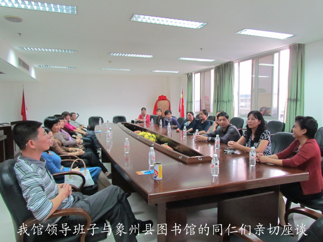 我馆领导班子与象州县图书馆的领导及同仁们进行了座谈。贺南潮书记(馆长)、覃建值副书记、李霞副馆长、陆庆副馆长等领导首先对象州同仁的到访表示热烈欢迎。李霞副馆长向客人们详细介绍了我馆的基础设施建设、馆藏资源建设、业务管理、免费开放等基本情况,并就相关工作进行了交流。