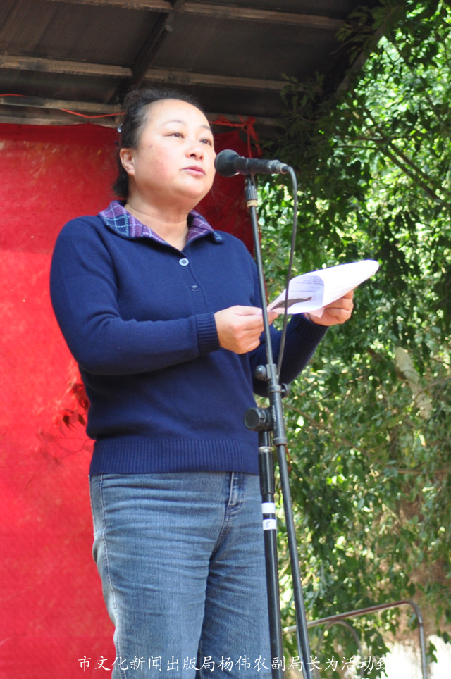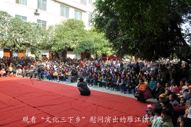 杨伟农副局长在致辞中称,在2012年元旦即将到来之际开展群众喜闻乐见的“文化三下乡”活动,是文化系统深入贯彻落实科学发展观和党的十七届六中全会精神的重要举措,也是文化工作紧紧围绕党和国家工作大局,服务广大乡镇居民,促进城乡和谐平衡发展的一项重要内容,活跃了乡镇文化生活,满足了广大居民的精神文化需求,今后我们还要把更多更好的文化活动送到居民身边,让广大城乡居民共享社会公共文化