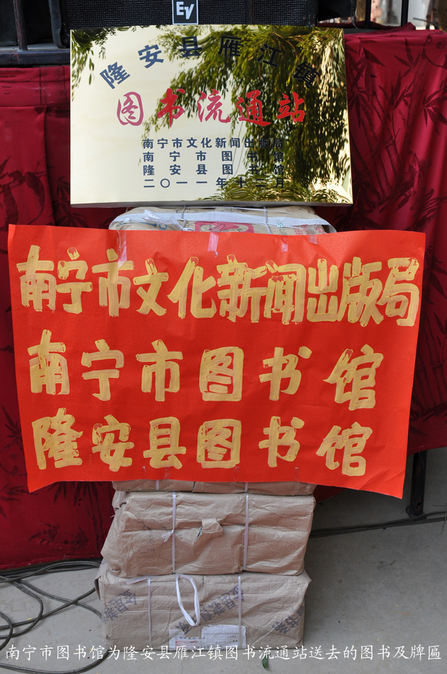 2011年12月15日上午,南宁市图书馆、南宁市少儿图书馆、南宁市群众艺术馆在南宁市文化新闻出版局的组织领导下,为隆安县雁江镇的群众送上了一场精彩纷呈的“文化三下乡”活动。南宁市文化新闻出版局副局长杨伟农、社文科科长谢榭等领导出席了活动。