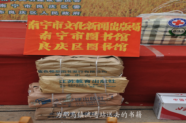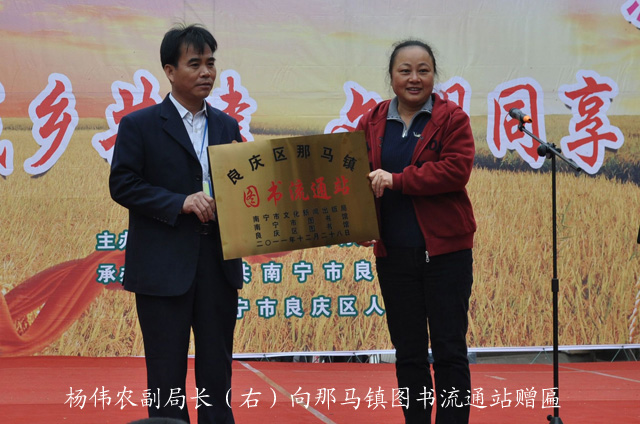 我馆作为南宁市文化新闻出版局的基层单位参加了本次活动,并在活动中与南宁市文化新闻出版局、良庆区图书馆共同在在那马镇文化站建立一所图书馆流通站。活动启动仪式上,南宁市文化新闻出版局副局长杨伟农将“良庆区那马镇图书流通站”的牌匾交到该镇文化站周大志站长手中,首次交流的南宁市图书馆300册藏书也将在该镇文化站供读者借阅,良庆区图书馆则负责对该文化站进行长期的图书馆业务指导工作。