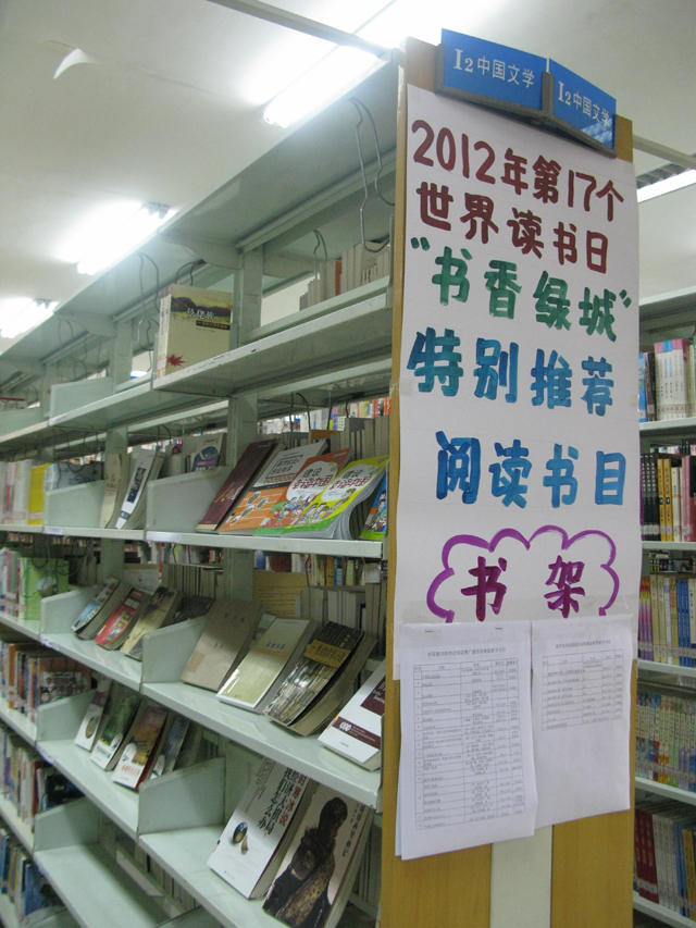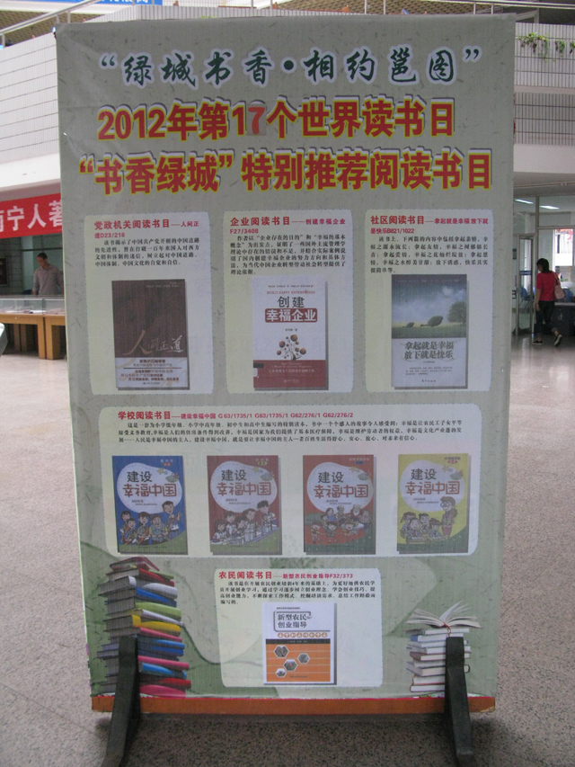 为配合南宁市“绿城书香”读书周的开展,我馆在二楼读者大厅推出“2012年第17个世界读书日‘书香绿城’特别推荐阅读书目”专题板报,在二楼文学借阅览室推出专题书架,展出由南宁市全民阅读活动组委会推荐的《人间正道》、《建设幸福中国》、《拿起就是幸福 放下就是快乐》、《创建幸福企业》、《新型农民创业指导》等图书,同时展出的还有中国图书馆学会“全民阅读”网站推荐的优秀图书,以及有关如何读书等等图书数十种,专题书架一经推出即受到广大读者的欢迎。