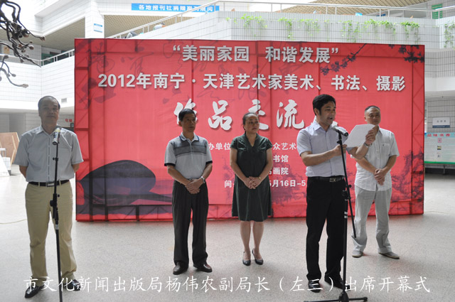 为了贯彻党的十七届六中全会精神,进一步落实中央关于公共文化场馆免费开放的要求,不断增强南宁市公共文化服务能力,推动首府文化的大发展大繁荣,南宁市图书馆与南宁市群众艺术馆、南宁市书画院共同主办了以“美丽家园、和谐发展”为主题的南宁•天津艺术家美术、书法、摄影作品交流展。
