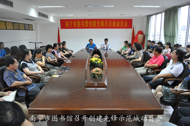 2012年5月11日,南宁市图书馆根据中共南宁市委、南宁市政府关于创建先锋示范城的有关决定,按照《南宁市文化新闻出版局关于创建先锋示范城的实施方案》的要求,为了贯彻落实市委从2012年起,用3至5年的时间,创建“全区一流,全国知名”的先锋示范城的规划部署,推进基层组织建设年活动,巩固和深化创先争优和“党组织建设年”活动,加强党建工作,加快实现首府南宁党的建设新跨越和图书馆事业又快又好地发展,制定了《南宁市图书馆关于创建先锋示范城的实施方案》,并组织全体党员召开了动员会。