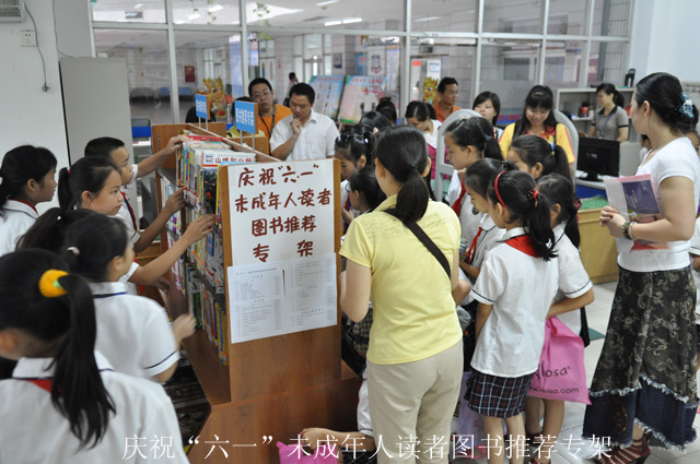 5月底,南宁市图书馆在文学借阅室推出了“庆六一”未成人专题图书推荐专架,精选了哲学、心理学、历史、地理、传记、语言文字学、艺术等社会科学图书,数学、天文、生物科学、植物学、中国百科全书等自然科学普及读物以及趣味性强的文学类图书。小读者们可以迅速地在书架上找到自己想看的图书,阅读变得更加方便与舒心。该专架一经推出,架上图书立即变得炙手可热,该借阅室的读者量和借阅率有了集中性的增长。