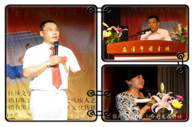 新书发布会上,龙歌梦想合唱团表演的《龙之歌》、能帮就帮》,、YY组合表演的《原野牧歌》,南国之光残疾人艺术团表演的《祖国不会忘记》,张元发表演的《没有翅膀也要飞翔》等精彩的节目为发布会助兴。桂林市文联主席、党组书记刘启春和南宁市图书馆副馆长李霞为新书《点亮人生》揭幕。李霞副馆长、桂林文学院院长刘敏、中国残疾人艺术团演员罗相军、南宁市残疾人联合会副理事长张穗先、《点亮人生》作者童团结、张严方分别作了重要讲话。新书《点亮人生》的主人翁黄友在新书发布会上作了精彩的励志演讲,赢得现场观众的热烈掌声。此外,发布会还进行现场签赠新书《点亮人生》。