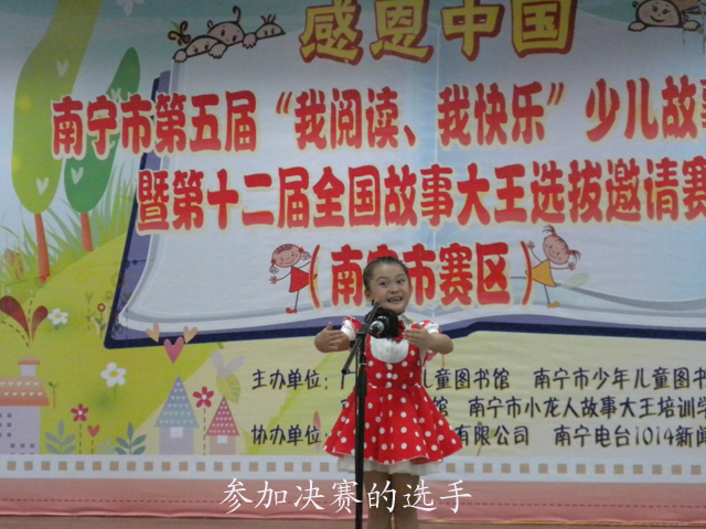 为了引导少年儿童多读书、读好书,弘扬中华民族传统文化,用优秀的故事教育和激励少年儿童紧跟时代步伐,5月19日至6月10日,由广西壮族自治区图书馆、广西少年儿童图书馆、南宁市图书馆、南宁市少年儿童图书馆、南宁市小龙人故事大王培训学校、南宁人民广播电台1014新闻台、广西榜样影视有限公司共同举办了南宁市第五届“我阅读、我快乐——感恩中国”少儿故事比赛暨“第十二届全国少年儿童故事大王选拔赛(南宁赛区)”。6月10日,南宁赛区决赛和颁奖典礼在广西图书馆多功能厅隆重举行。