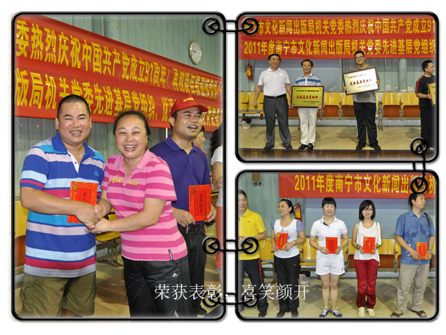 活动首先举行2011年度南宁市文化新闻出版局机关党委先进基层党组织、优秀共产党员和优秀党务工作者颁奖仪式,并开展新党员入党宣誓和“重温入党誓词”。仪式由局党组副书记、常务副局长于维钢主持。局机关党组成员对先进基层党组织、优秀共产党员、优秀党务工作者进行了表彰。我馆覃建值副书记荣获文化新闻出版局系统2011年度优秀党务工作者光荣称号,邵高宁等6名同志被评为优秀共产党员;石璐璐、杨彤荔两名预备党员参加了入党宣誓,全体党员与新党员一起重温了入党誓词。