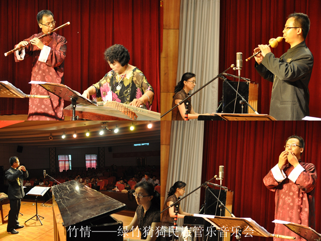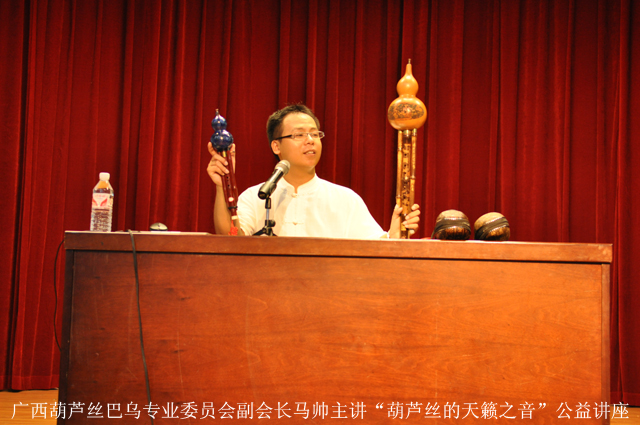 此外,广西葫芦丝巴乌专业委员会副会长、广西艺术学院竹笛学会会长、广西艺术学院笛子客座教师、国家级社会基础艺术学课题《炻质火型多指孔脸谱埙》研制组成员马帅不仅在7月5日盛情上演的竹情•绿竹猗猗——马帅民族管乐音乐会上,与著名古筝教育家、作曲家、中国民族管弦乐学会广西分会副会长、广西古筝学会会长、广西艺术学院副教授林坚筝箫合奏的《湘妃泪》、《妆台秋思》两曲赢得了现场观众的热烈掌声,他还在7日下午主讲了一场公益讲座——葫芦丝的天籁之音,简单易懂、轻松易学的内容令大家在快乐轻松的气氛中学习到了指法、识谱、基本乐理及《我和你》、《蚂蚁搬家》等练习曲,现场上不少第一次接触葫芦丝吹奏学习的读者朋友在听完讲座后,马上就可以上台演奏《龙的传人》等曲目,该讲座使大家不再仅限于作一位音乐的聆听者,而是更能通过活动参与到音乐的表演中,甚至创造音乐,徜徉于美妙的竹乐世界。