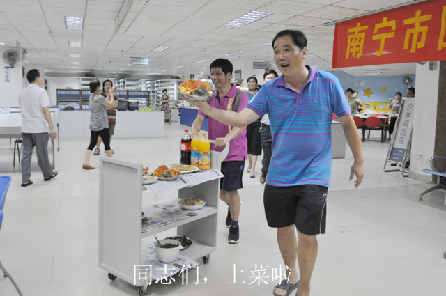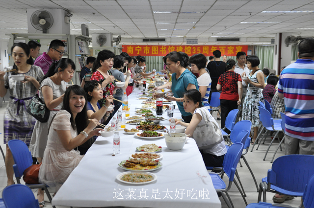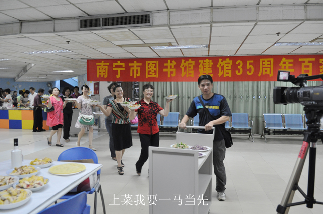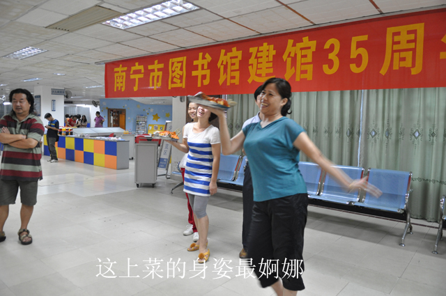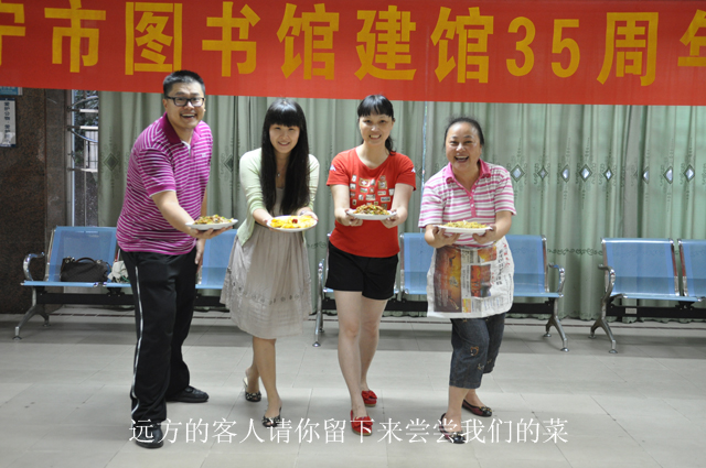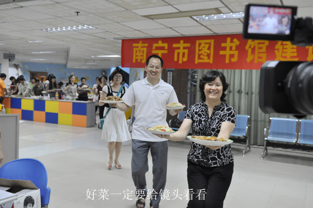 2012年6月29日晚,南宁市图书馆举行了一场温馨热闹的“庆祝建馆35周年百家宴”活动,全馆职工纷纷献厨,亮出自家的“独门秘籍”,将精心烹制的200余盘菜肴与大家分享,拉近了彼此间的距离,增进了感情,营造了图书馆大家庭般快乐融洽的良好氛围。