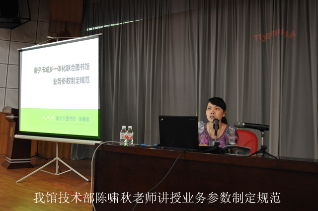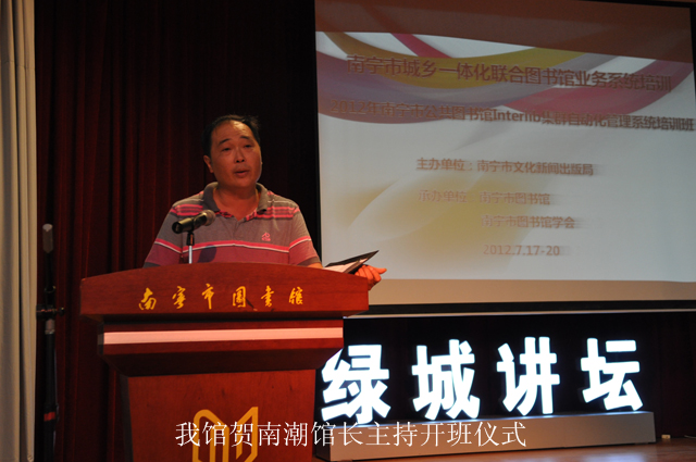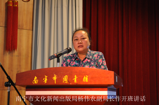 此次活动得到了南宁市文化新闻出版局的高度重视和大力支持。市文化新闻出版局杨伟农副局长亲临开班仪式现场,为培训班开班致辞。杨副局长在全面分析南宁市文化体制建设现状的基础上,指出了开展“城乡一体化联合图书馆”建设是现代化图书馆发展的必然选择,对实现我市公共文化服务体系协调发展、促进南宁市文化大发展大繁荣有着重要的意义。她强调,此次培训是为确保“南宁市城乡一体化联合图书馆”项目在全市顺利推广与实施而开展的一次重要培训,不仅是推动实现市内公共图书馆的业务升级,加强各系统图书馆之间文献资源共建共享的重要举措,也是图书馆人员系统学习新知识、发展新业务,全面提升自我综合能力的一次难得的机遇。希望同志们珍惜机会,认真学习,做到学有所得;并联系实际,学以致用,使本次学习取得实实在在的效果,把所学知识转化为服务基层、服务群众的扎实本领。