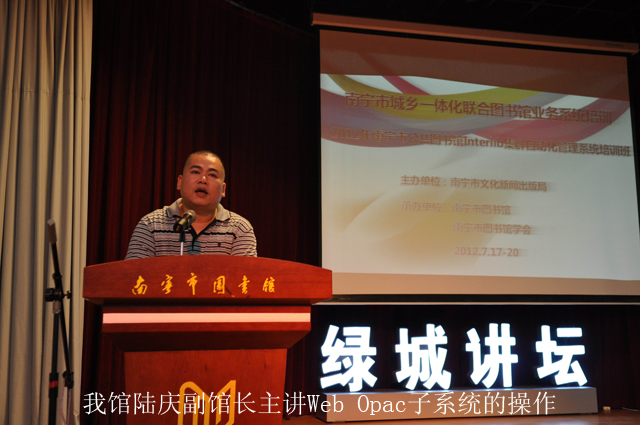 为进一步推动“南宁市城乡一体化联合图书馆”项目进程,切实提高各成员馆对Interlib集群自动化管理系统的应用能力,2012年7月18日至19日,由市文新局主办、市图书馆和市图书馆学会联合承办的“南宁市公共图书馆Interlib集群自动化管理系统培训班”在我馆隆重开幕。各县、区图书馆和部分学校、医院等系统图书馆的馆长和技术人员及我馆全体员工共120余人参加了培训。