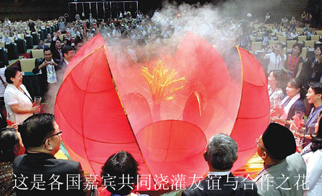 开慕式最后一个仪程:一朵象征着友谊与合作的花朵在亚洲各国文化部门官员、图书馆界人士的“浇灌”下缓缓盛开,标志着2012年中国—东盟文化论坛开幕。