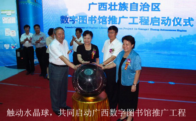 启动仪式上,国家图书馆与广西壮族自治区文化厅签订开展“数字图书馆推广工程”战略框架协议。文化部副部长赵少华,自治区党委常委、宣传部部长沈北海,自治区副主席李康,国家图书馆馆长周和平,在仪式现场触动水晶球,共同启动广西数字图书馆推广工程。
