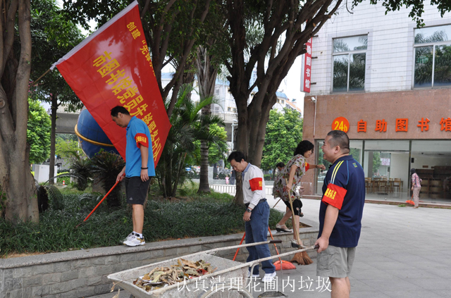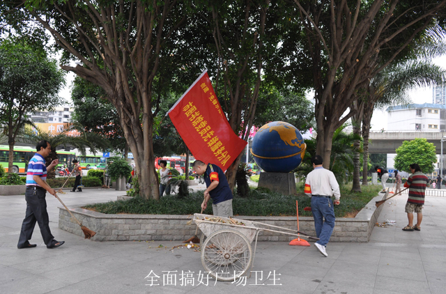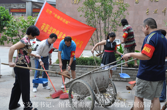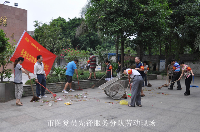 为认真贯彻落实南宁市委、市政府关于大清扫工作的整体部署,进一步发挥南宁市图书馆党支部党员先锋服务队在服务“两会一节”中的先锋模范作用,为即将召开的“两会一节”和中秋国庆佳节的到来营造优美、整洁、有序的市容环境,南宁市图书馆党支部依照中共南宁市直属机关工委委员会的通知要求,于2012年9月17日开展服务“两会一节”、喜迎中秋国庆市容环境卫生大清扫活动。