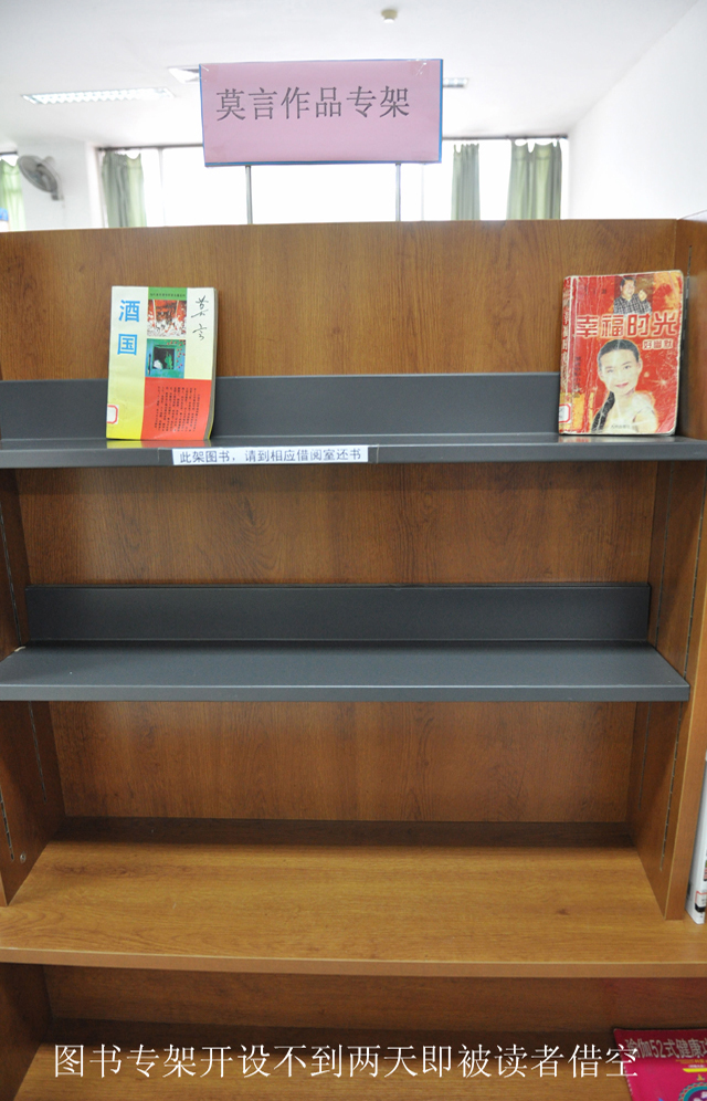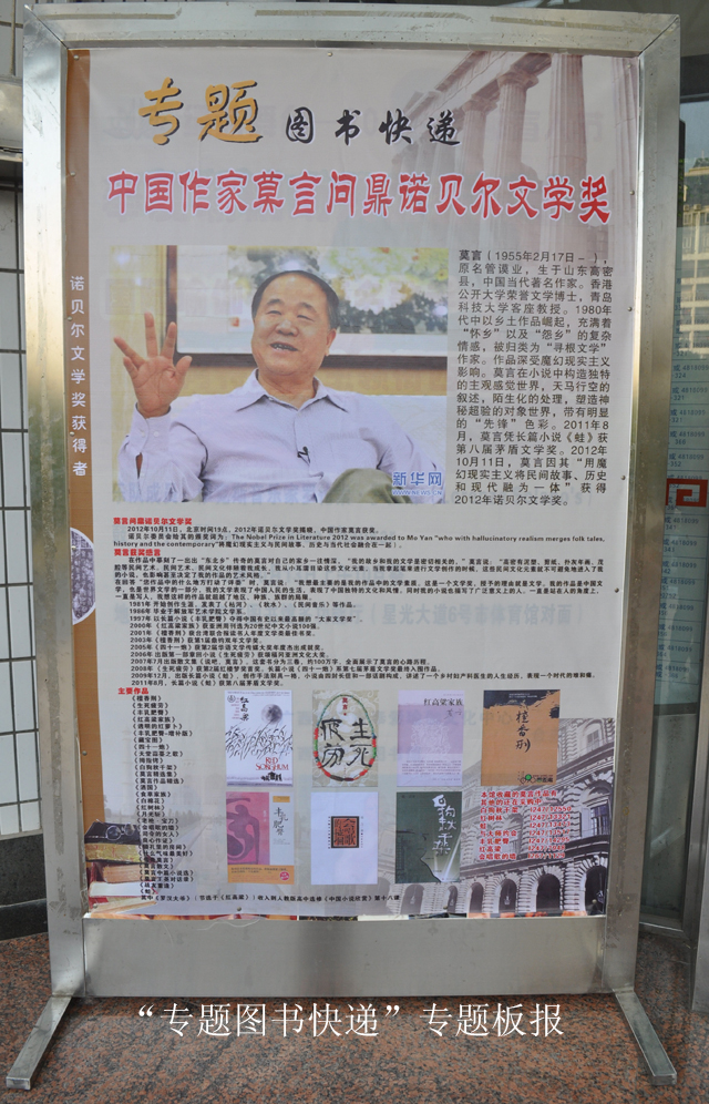 10月11日,2012年诺贝尔文学奖揭晓莫言获奖后,南宁市图书馆第一时间在馆门口推出“专题图书快递”莫言专题并在文学借阅室开设莫言作品专架,为读者集中展出包括《檀香刑》、《生死疲劳》、《丰乳肥臀》、《红高粱家族》、《透明的红萝卜》、《藏宝图》、《司令的女人》、《白狗秋千架》等多部作品,让读者第一时间感受到最新、最快的好书。