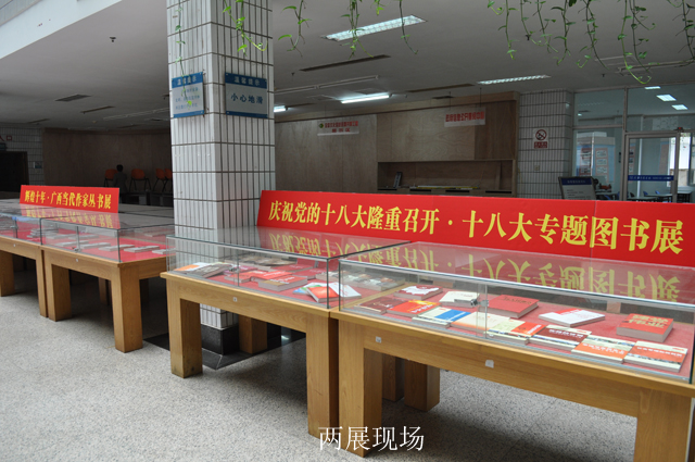 在十八大胜利召开之际,南宁市图书馆首先推出了庆祝党的十八大隆重召开•十八大专题图书展,展出《非凡十年迎接十八大》、《幸福写在民生上》、《十八大主题读本》、《中国科技创新十年大观》等十八大专题图书近百册,同时推出的辉煌十年•广西当代作家丛书展展出了《广西当代作家丛书》第4辑和《广西当代文艺理论家丛书》第一辑等七十余册,以文学的视角展示了广西壮族自治区十年来所取得的可喜成绩。