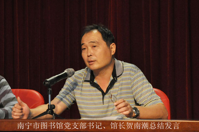 最后,南宁市图书馆党支部书记贺南潮强调,我们要认真学习、深刻领会、宣传贯彻好党的十八大精神,在今后的工作中,一定要将学习贯彻十八大会议精神落实和渗透在个人和各岗位的具体实践当中,要把“十八大”精神作为推动我馆各项工作和读者服务的行动指南和动力源泉,要把学习贯彻十八大精神与基层党组织建设相结合,与提高服务质量与服务水平相结合,将图书馆的创先争优常态化、长效化。