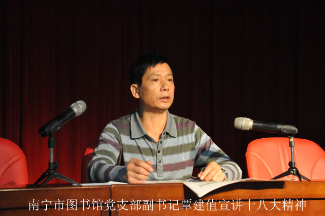 在会议上,南宁市图书馆党支部副书记覃建值传达了胡锦涛和习近平同志的讲话内容,重点对十八大报告中的精髓部分如“五位一体”、“八个必须”、“七个全新”等内容作了深入解读。他指出,准确把握十八大报告的主题是学习和贯彻十八大精神的前提,“科学发展观”重要思想则是十八大的灵魂,是对马克思列宁主义、毛泽东思想和邓小平理论的继承和发展,是加强和改进党的建设和发展的强大理论武器,是我们工作必须长期坚持的指导思想。确立“科学发展观”重要思想的重要指导地位,是十八大的一个历史性贡献。十八大报告对鼓舞和动员全党全国各族人民在新的历史条件下建设中国特色社会主义,实现全面建成小康社会宏伟目标,具有重大战略意义。