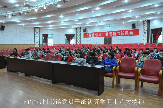 当天下午,南宁市图书馆全体人员还参加了在我馆召开的南宁市文化新闻出版系统学习十八大精神大会,听取上级党组织对十八大精神的解读和下一阶段工作的指示,进一步领会精神,加强学习,争创业绩。