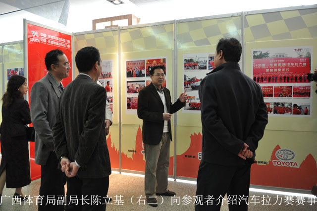 12月9日上午,由中国东盟国际汽车拉力赛组委会办公室、广西汽车摩托车运动协会和南宁市图书馆联合举办的“2006-2012中国-东盟国际汽车拉力赛暨中国-东盟媒体汽车拉力赛摄影回顾展”在南宁市图书馆开展。广西体育局副局长陈立基,广西公安厅交警总队政委李幸、南宁市人大常委会副秘书长宋道安、南宁市体育局副局长郑家海和南宁市图书馆馆长贺南潮出席了开幕式。