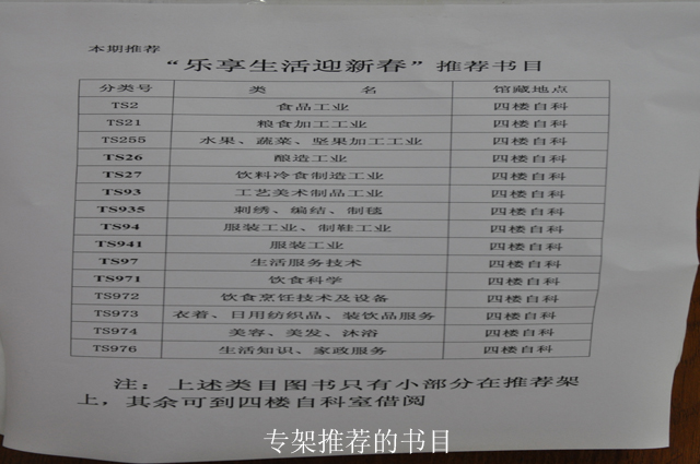 临近春节,南宁市图书馆外借部为丰富广大读者的假期生活,让大家在忙碌了一年之后过上一个有滋有味的春节,尽情享受生活中的各种乐趣,我馆特别推出一期“乐享生活迎新春”为主题的图书推荐专架,希望能为读者朋友们度过一个健康、快乐、祥和的春节提供一些参考与建议。图书的内容涉及菜谱、DIY自制饮料、美容、美发及各种生活知识。