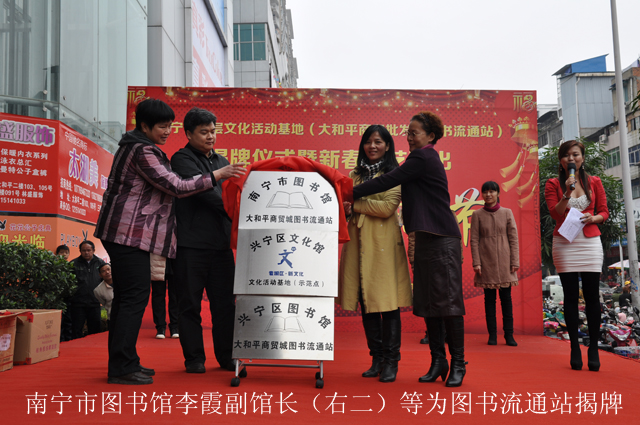 1月25日上午,南宁市图书馆、兴宁区图书馆大和平商贸城图书流通站揭牌仪式在大和平商贸批发城隆重举行,兴宁区委常委、宣传部部长、政府副区长林涛、南宁市图书馆副馆长李霞、兴宁区文体局局长吴豫、大和平经理陆文伟共同为图书流通站揭牌。这意味着,大和平商贸批发城的商户和业主足不出户即可享受到丰富的文化大餐。