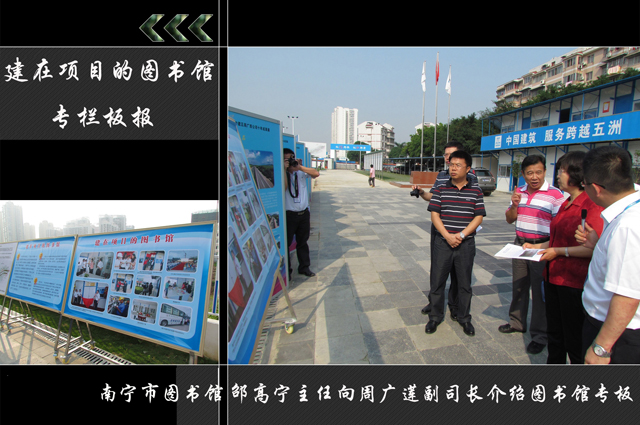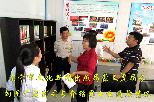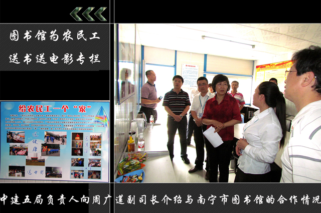 5月13日上午,国家文化部公共文化司副司长周广莲、公共文化司活动指导处处长朱渤一行在广西壮族自治区文化厅纪检组组长李晓泉、南宁市文化新闻出版局局长蒙文虎等区市领导的陪同下,来到中建五局土木工程有限公司广西分公司调研“工地图书流通站”的情况,在现场就农民工文化服务工作开展情况和针对提高农民工文化素养而建立的“信和图书流通站”建设情况进行了实地考察并给予佳评;同时对建筑行业工地农民工文化生活情况进行了亲切询问,还参观了目前在建的南湖——竹排冲项目。