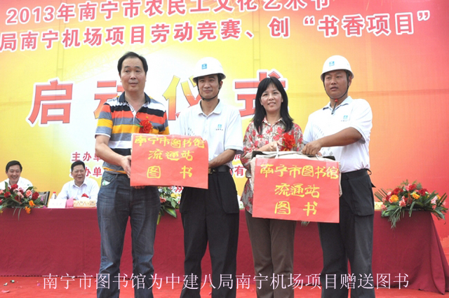 4月25日下午,满载书香的南宁市图书馆“汽车图书馆”开进热火朝天的中建八局“南宁机场项目”工地,参加由南宁市文化新闻出版局主办、南宁市图书馆、南宁市群众艺术馆协办的“文化伴你行·情暖农民工”2013年南宁市农民工文化艺术节启动仪式。