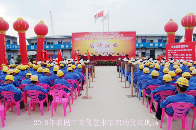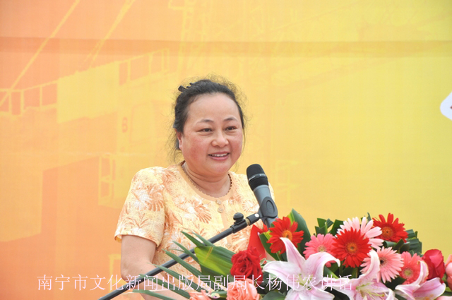 在启动仪式上,南宁市文化新闻出版局副局长杨伟农应邀讲话。杨副局长首先对本届南宁市农民工文化艺术节的启动表示热烈的祝贺,希望南宁机场项目所有工友们积极参加南宁市“文化伴你行”系列文化活动、“快乐读书站送书活动”、“‘绿城讲坛’公益讲座”以及“唱响和谐、放飞梦想——南宁市外来务工人员卡拉OK比赛”等活动,共同为建设农民工新的文化精神家园而努力奋斗。