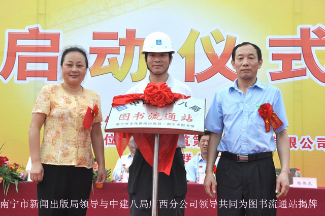 在工地负责人宣读“创书香工地“活动方案后,杨伟农副局长亲自为“南宁市图书馆中建八局南宁机场项目工地流通站”授牌,南宁市图书馆馆长贺南潮、副馆长李霞为南宁机场项目工地的农民工送上540册图书和200册期刊,这些书刊将放在流通站内供农民工朋友及项目工地的职工在闲暇的时候阅读,为工地正创建的“书香工地”活动“添砖加瓦”。