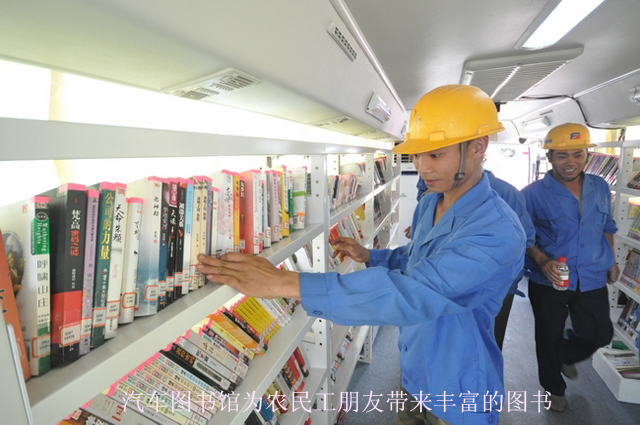 在启动仪式开始前,南宁市图书馆的“汽车图书馆”就吸引了不少农民工朋友上车阅读。我们带去的近千册图书,让农民工朋友和项目工地的职工享受到在图书馆阅读的乐趣。
