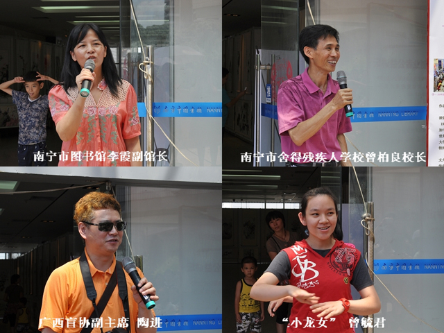 6月1日上午,南宁市图书馆和南宁市舍得残疾人学校携手举办的励志·感恩·奉献——2013年“七彩童年”迎“六·一”曾柏良师生作品展在南宁市图书馆“绿城展廊”隆重开幕,李霞副馆长对该展寄予厚望,并在致辞中承诺,将一如既往地支持助残事业;南宁市美术家协会副主席、光明画派创始人、南宁市舍得残疾人学校校长曾柏良和广西盲协副主席陶进也到场参加了开幕式,预祝该展取得圆满成功。