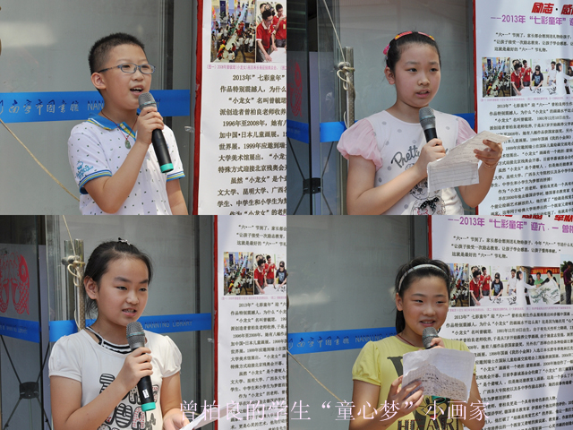 在展览现场,一幅长7米的画卷上,50只婀娜多姿的孔雀神态各异,高贵中透着灵性,这是聋哑孤儿“小龙女”最近创作的国画作品“七彩梦”,被大家公认为是“七彩童年”迎“六·一”曾柏良师生作品展的一个亮点。“童心梦”组合中的5个孩子都是曾柏良的“铁杆粉丝”,他们被曾柏良40年坚持爱心助残的善举所感动,不约而同地拜其为师,曾柏良的高徒“小龙女”也常教他们画画,5个小学生拜师学画不到一年时间,不仅取得了令人欣喜的成绩,还培养了浓郁的爱心,他们希望和老师共同努力,尽量帮助残疾人,并希望通过画展,呼吁更多人加入到助残队伍中来,这就是他们心中的梦,故取名“童心梦”。“童心梦”组合在该展中展出的30多幅作品有的个性张扬,有的沉稳大气,有的清新脱俗,着实童趣十足。