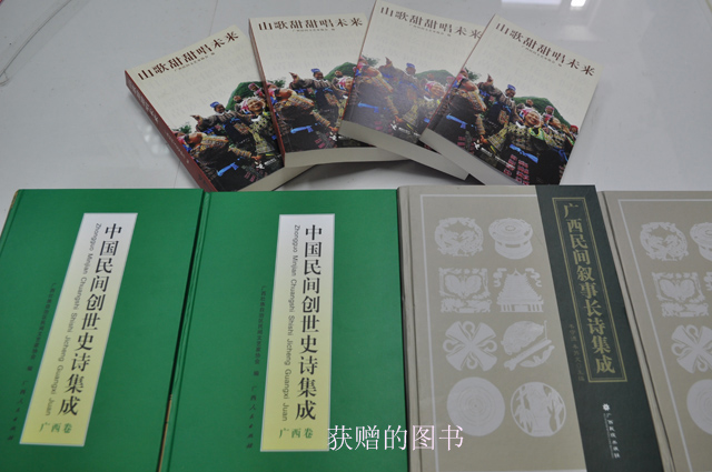 6月8日,受广西民间文艺家协会邀请,我馆李霞副馆长参加了自治区文联举办的山歌集《山歌甜甜唱未来》首发仪式。在首发仪式上,我馆与广西图书馆、广西大学图书馆、广西民族大学图书馆、广西师范学院图书馆均获得由广西民间文艺家协会主编的《山歌甜甜唱未来》、《中国民间创世史诗•广西卷》以及韦守德、韦苏文根据中国民间文艺家协会《关于实施中国民间文化抢救工程的通知》精神进行编纂的《广西民间叙事长诗集成》等多本珍贵的地方文献。