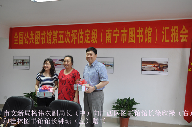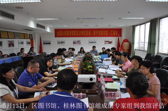 5月13日,由广西区图书馆、桂林图书馆等组成的评估专家小组一行来到南宁市图书馆,就全国第五次县级公共图书馆评估定级工作进行验收。南宁市文化新闻出版局副局长杨伟农、公共文化科科长谢榭及我馆馆长贺南潮、副书记覃建值、副馆长李霞、副馆长陆庆等人陪同。