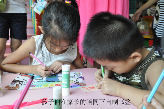 该活动邀请到了绘本妙妙屋的闵惠老师来给孩子们做绘本阅读指导。闵惠老师给孩子们讲了一个绘本故事——《一只有教养的狼》。该绘本主要阐述了“读书”的好处及乐趣,作者刻意选择“大野狼”作主角,意在揭示读书可以将野蛮个性转变成有教养的气质。幽默成趣的语言以及诙谐自然的画风,闵惠老师读来妙趣横生,孩子们听得津津有味。 绘本是通过图画和文字共同叙述一个完整的故事,在绘本里,图画不再是文字的附庸,而是一本好绘本的生命。从孩子的发展特点来说,单纯的文字难以激发他们的阅读兴趣,而优美或有趣的图画则能够吸引他们。孩子们通过耳朵来听故事,用眼睛看图画,不仅能够加深他们对故事的印象,还能激发他们的想象力和创造力。《一只有教养的狼》还传达了分享的观念,阅读也是可以分享的。通过闵惠老师绘声绘色、手舞足蹈的讲述,这个绘本故事中“读书使人有教养、阅读大家齐分享”的观点被孩子们牢牢记住了。当天的活动中,闵惠老师还带领亲子家庭跳了开场舞《虎姑婆》和结束舞《小小星愿》,玩了《爬爬运书》、《踢球》等锻炼眼睛和肢体协调运动的游戏,在最后还让孩子们运用彩纸、画笔和胶贴自己动手制作书签。