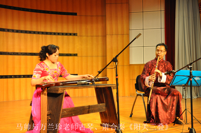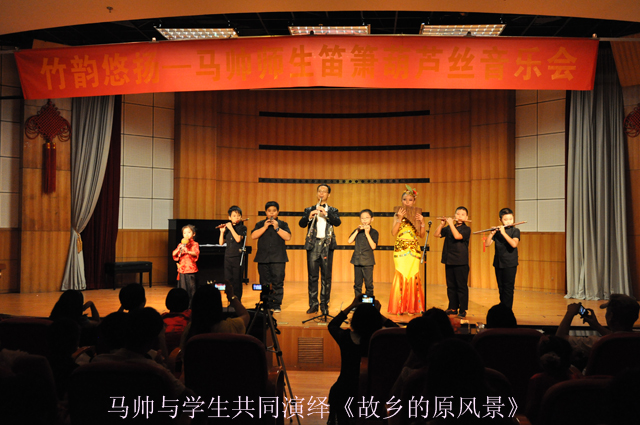 竹里馆•笛箫葫芦丝艺术中心已连续三年在“绿城舞台”举办马帅师生音乐会,广西葫芦丝巴乌专业委员会副会长、胡结续笛子艺术研究中心理事马帅在本次音乐会中不仅担任导聆——向听众介绍曲目背景、演奏技法、演员阵容等,还与古琴演奏家万兰珍合奏了古琴、箫曲《阳关三叠》,与广西幼儿师范高等专科学院青年骨干教师蒙春娟合奏了钢琴、竹笛改编版《土耳其进行曲》,并率领其学生们在终曲用箫、陶笛、埙、排箫、葫芦丝、巴乌、竹笛合奏了《故乡的原风景》,经过不同乐器的组合编排,使经典名曲焕发了新的生命,带给听众别具一格的感受。学习艺术最重要的是提高修养,马帅在对学生们的演奏技艺精雕细琢的同时,还注重培养学生的音乐鉴赏能力及音乐创作能力,这使得学生们的各个演出曲目都呈现出了高水平、个性化的特点。