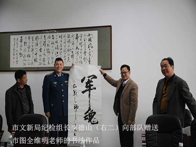 活动当天,市文新局党组成员、纪检组长李德山、市图书馆馆长贺南潮还共同向南宁空军某部政委赠送图书馆活动部全维明主任亲笔书写的“拼搏”、“军魂”两幅书法,表达地方对部队官兵顽强拼搏、英勇不屈的精神的崇敬之情。部队领导对市图书馆表示诚挚的感谢,并希望今后市图能到部队开展更多的文化活动,巩固军民鱼水之情,促进地方和部队更加多元化的合作共建。