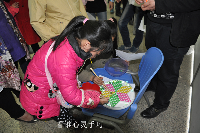本次活动为同学们推出了“一气呵成”、“爱不释手”、“画龙点鼻”、“火眼金睛”、“心灵手巧”、“我猜我猜我猜猜猜”等形式多样、内容丰富的节目。只见参加“一气呵成”的同学们个个憋足了气、鼓足了腮帮子努力吹灭蜡烛盘;“画龙点鼻”的同学们自己用纸片遮住眼睛去指小丑人儿画像的大红鼻子;“爱不释手”的孩子们挽起了袖子努力捉住盆子里的小泥鳅……孩子们你追我赶,兴致昂扬地穿梭在各组项目队伍中,笑声溢满整个大厅。